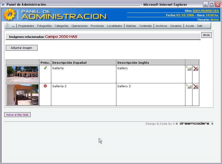 Muestra un listado de las distintas fotografías asignadas a un determinado registro de propiedad, con controles para edición y borrado, además de un formulario para asignar una imagen a un registro dado mediante la búsqueda de las imágenes disponibles en el servidor. |